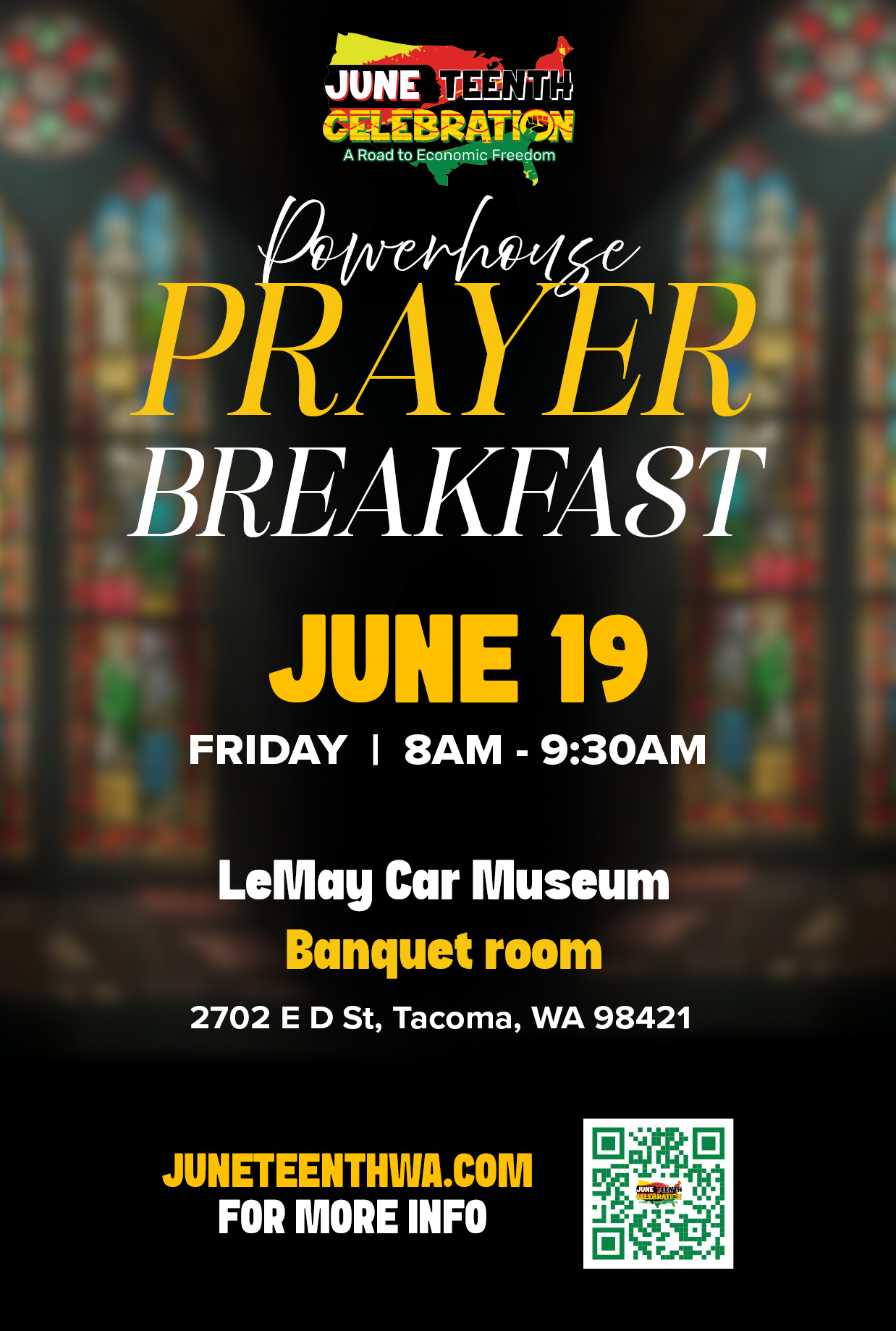 Join us for the Annual Juneteenth Prayer Breakfast—an intentional moment of reflection, unity, and purpose as we begin Washington State’s largest Juneteenth celebration. Hosted at the LeMay – America’s Car Museum Banquet Room, this gathering brings together leaders and community partners committed to justice, opportunity, and economic freedom.